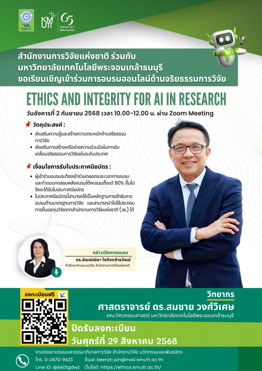 กรกฎาคม 29, 2025เข้าร่วมฟรี! การอบรมเชิงปฏิบัติการ Research Integrity Train-the-Trainer จัดโดย สำนักงานการวิจัยแห่งชาติ (วช.) ร่วมกับ มหาวิทยาลัยเทคโนโลยีพระจอมเกล้าธนบุรี (มจธ.)🎓 เข้าร่วมฟรี! การอบรมเชิง […]
