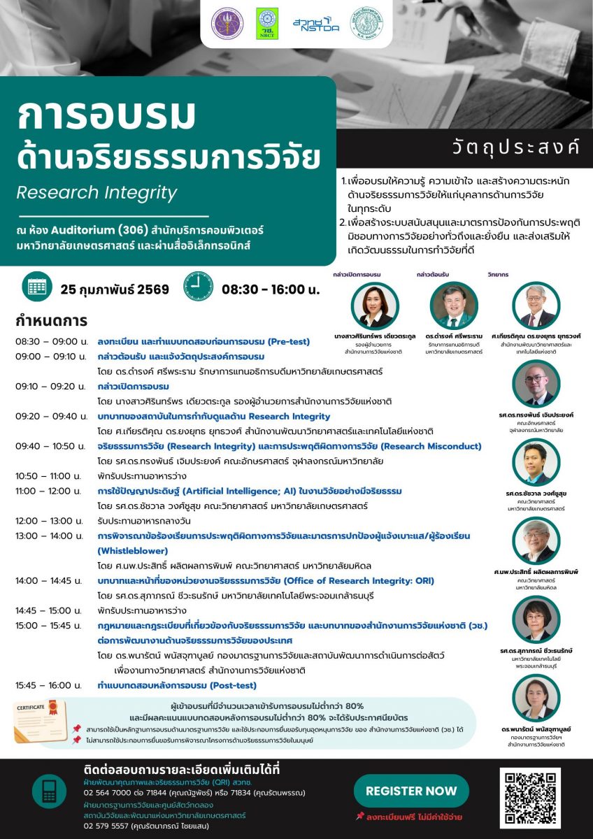 ธันวาคม 3, 2025สำนักงานการวิจัยแห่งชาติ (วช.) ร่วมกับ สำนักงานพัฒนาวิทยาศาสตร์และเทคโนโลยีแห่งชาติ (สวทช.) และมหาวิทยาลัยเกษตรศาสตร์ จัดการอบรมด้านจริยธรรมการวิจัย (Research Integrity)